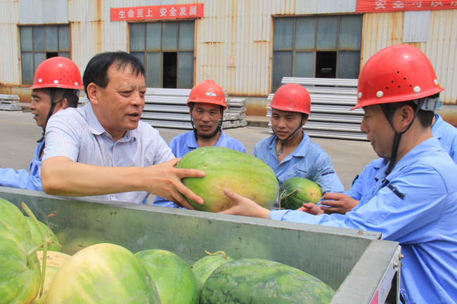 7月16日,新安縣人大副主任、縣總工會(huì)主席王保敏,黨組書(shū)記王新?tīng)I(yíng),副主席梁松獻(xiàn)在集團(tuán)公司總經(jīng)理郭峰,黨委副書(shū)記、工會(huì)主席王宏偉等的陪同下,到萬(wàn)基鋁業(yè)一公司、二公司、萬(wàn)基金屬鈉公司的電解車(chē)間等高溫崗位進(jìn)行慰問(wèn),送上西瓜6000余斤,使生產(chǎn)一線員工在炎炎盛夏中感受到了絲絲清涼。