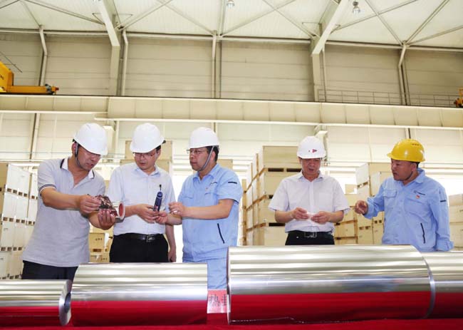 6月1日,洛陽國機重工有限公司張國龍等一行到我公司參觀訪談,集團公司董事長李躍民陪同。圖為在萬基鋁加工公司參觀鋁箔生產線。