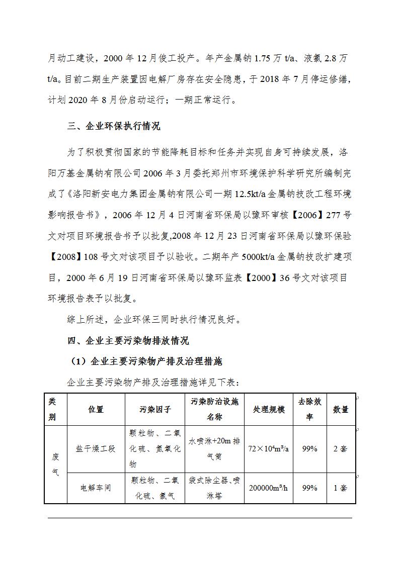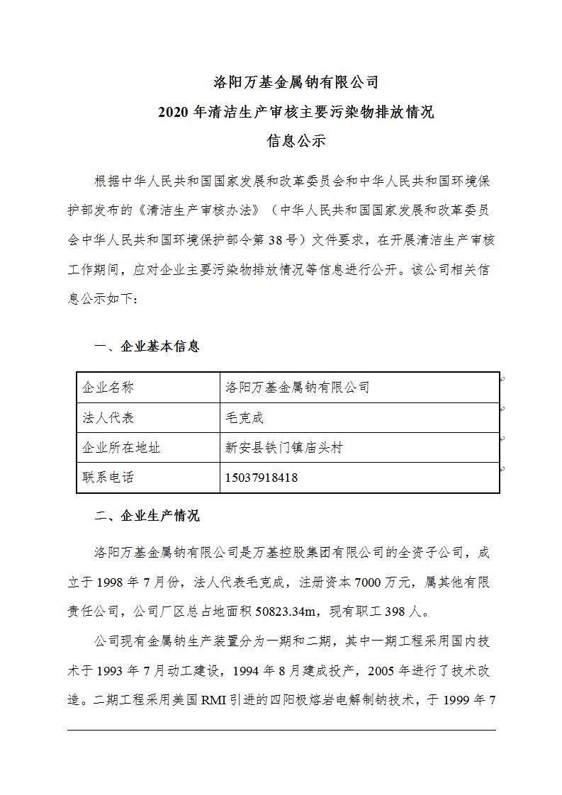 洛陽(yáng)萬(wàn)基金屬鈉有限公司2020年清潔生產(chǎn)審核主要污染物排放情況信息公示